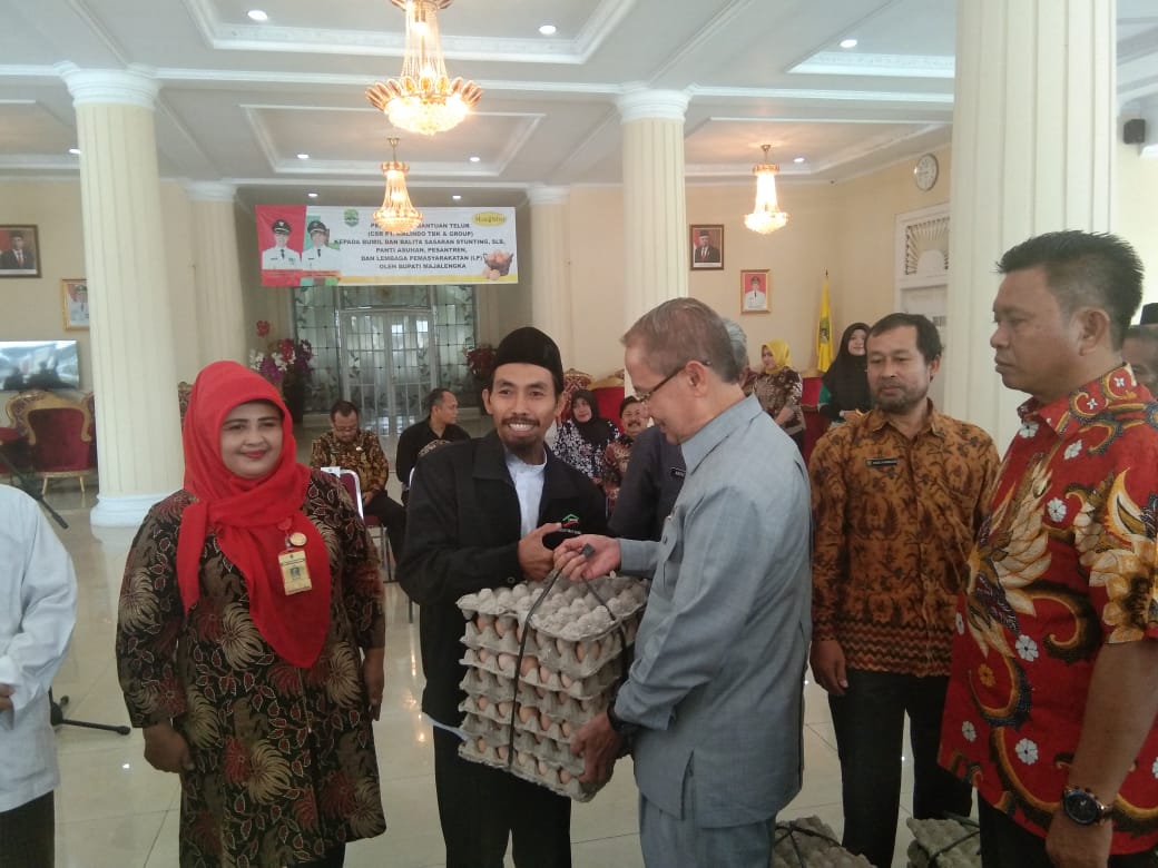 menyerahkan bantuan sebanyak 140 ribu telur ayam.Di Gedung Pendopo Negara, Kamis (12/03/2020).Bantuan itu merupakan dana CSR PT Malindo TBK dan Group.Adapun bantuan itu diberikan kepada Bumil dan Balita sasaran Stunting, SLB, Panti Asuhan, Pesantren dan LP.