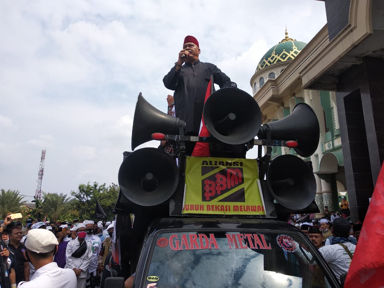 “Pancasila jangan hanya bisa di ucapkan saja dalam lisan, ketika ada yang mau merubahnya, kita harus berani maju dan menolak sebagai bentuk penghargaan terhadap jasa jasa para pahlawan,”teriak Ketua Jawara Bekasi, Damin dalam orasinya.