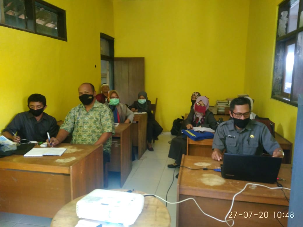 tentang kurikulum.Kepsek SDN Sukapura Kabupaten Tasikmalaya, Dede Rukanda S.Pd.Berikan bimbingan pembedahan kurikulum kepada sejumlah gurunya.Dalam pemberian materi itu, dilakukan dengan mengikuti protokol kesehatan.