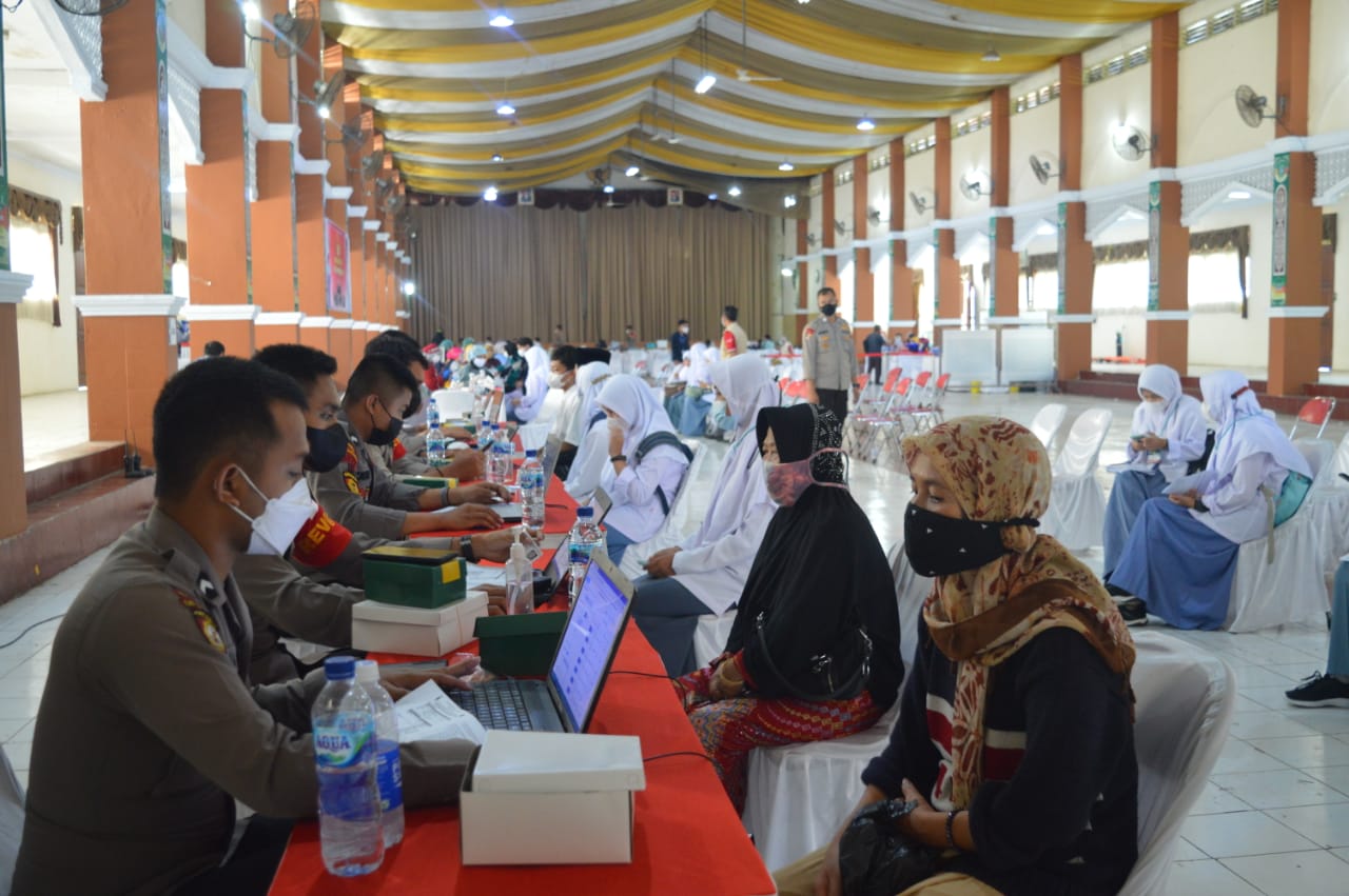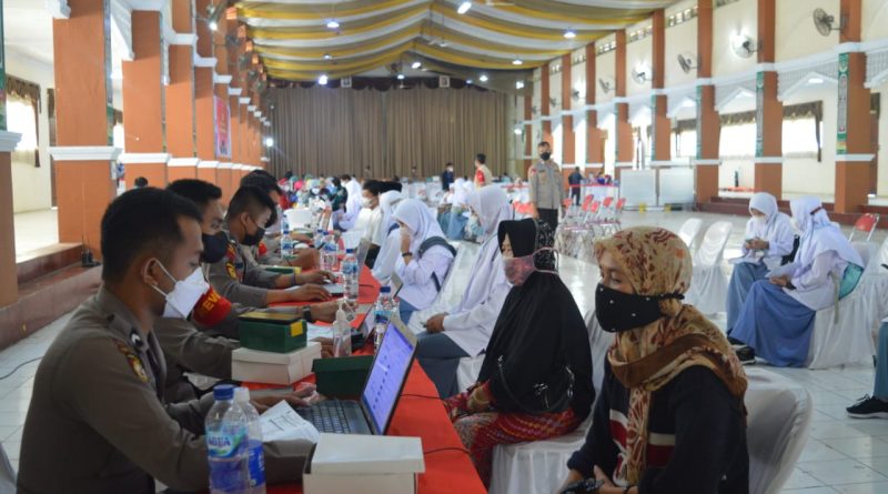 Kab.Tasik (kilangbara.com)-Polres Tasikmalaya, bersama Dinas Kesehatan dan Pengendalian Penduduk, Kabupaten Tasikmalaya. Berikan vaksinasi massal, Senin (26/07/21) kepada ribuan santri yang berada di 5 Pondok Pesantren (Ponpes). Diantaranya, Ponpes Cipasung, Sukahideng, Miftahul Huda, Sukamahan dan PCNU Kabupaten Tasikmalaya.