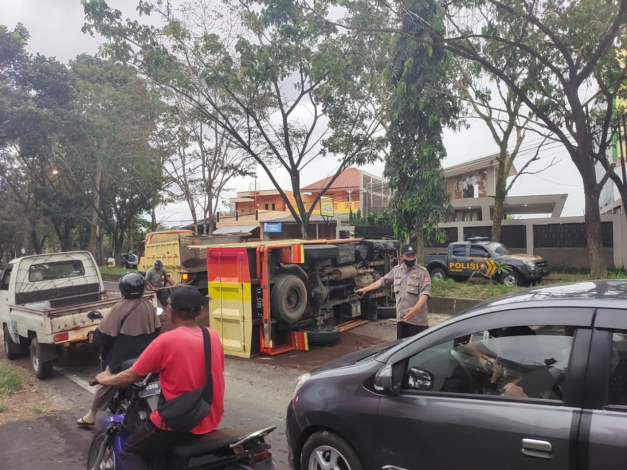Kota.Tasik (kilangbara.com)-Truk colt diesel bermuatan pasir dengan bernopol Z-8015-KX yang dikendarai Adi Bayu (21) terguling. Di Jalan Letjen Mashudi Kelurahan Setiajaya, Kecamatan Cibeureum, Kota Tasikmalaya, Kamis (10/03/2022).