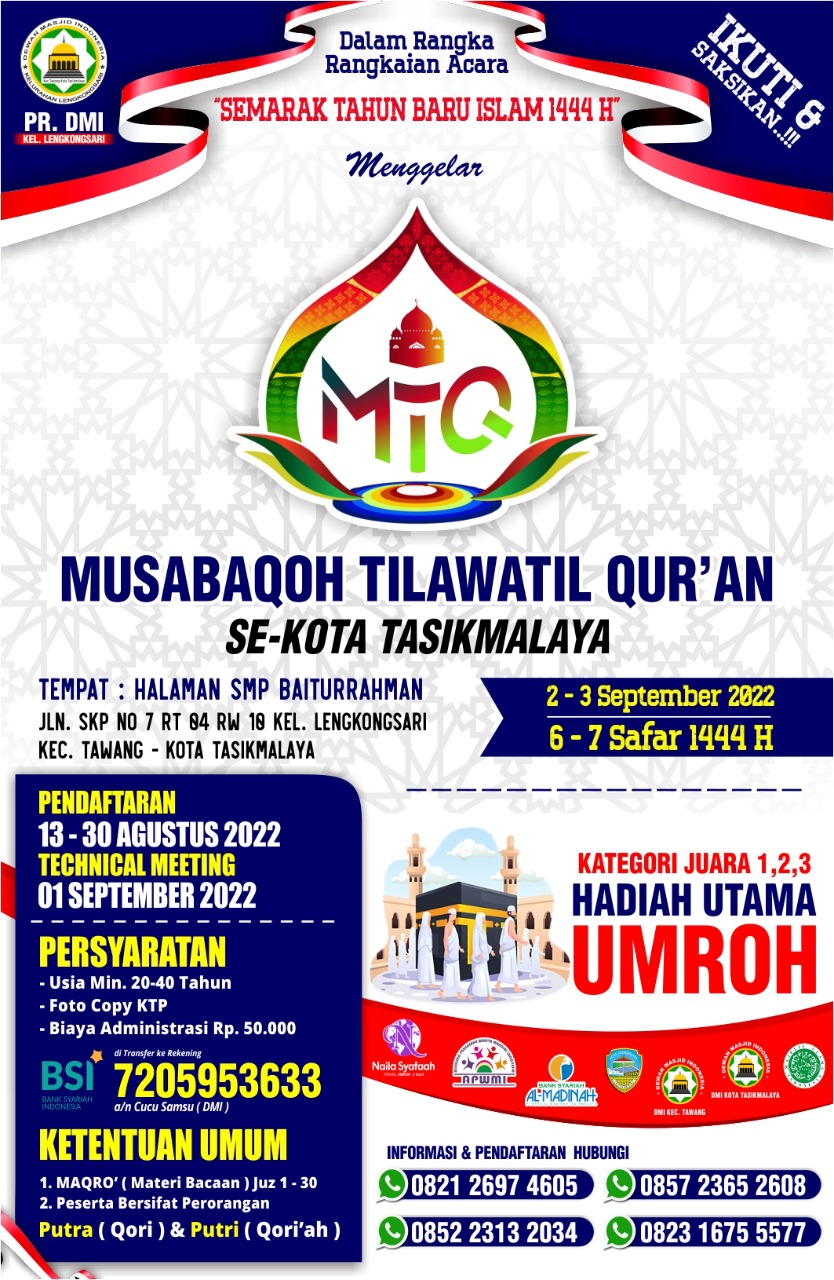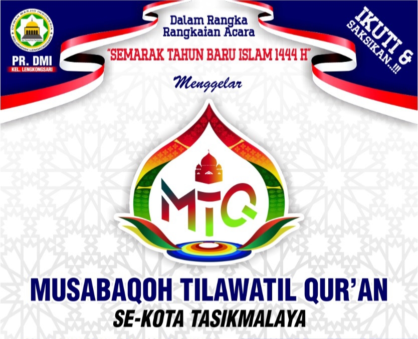 Kota.Tasik (kilangbara.com)-Dalam rangka rangkaian acara semarak tahun baru islam 1444 hijriah. PR Dewan Mesjid Indonesia (DMI) Kelurahan Lengkongsari, Kecamatan Tawang, Kota Tasikmalaya akan mengelar MTQ se-Kota Tasikmalaya. Lomba tersebut, bakal diadakan dihalaman, SMP Baiturrahman di Jalan SKP Nomor 07 RT 04 RW 10 Kelurahan Lengkongsari, Kecamatan Tawang, Kota Tasikmalaya, 2-3 September 2022.