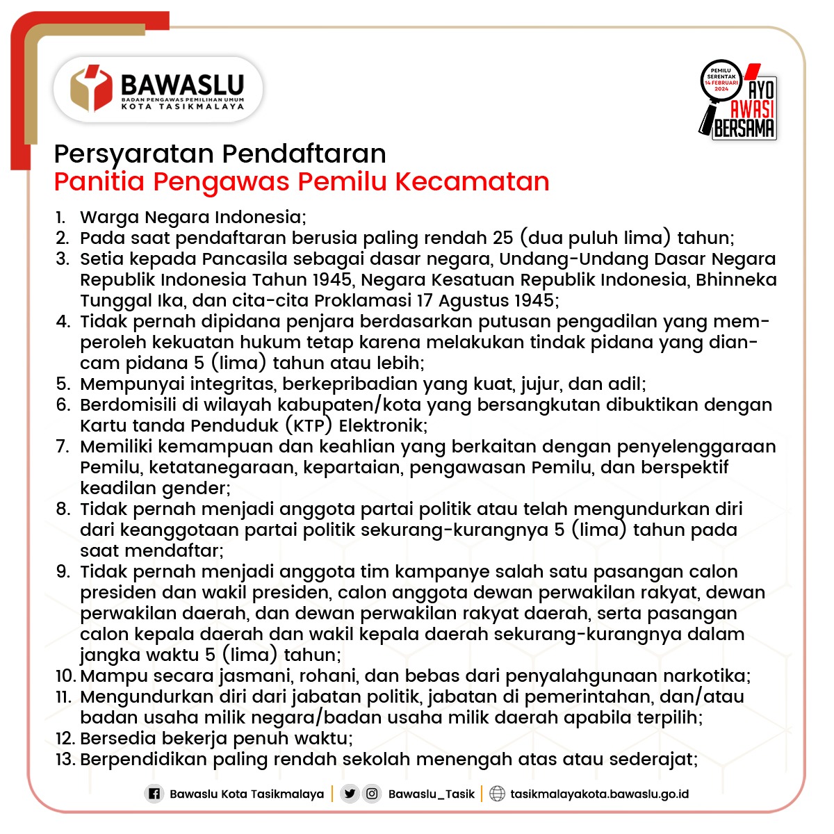Buruan Daftar!Bawaslu Kota Tasik Buka Lowongan Panwascam, Ini Syaratnya