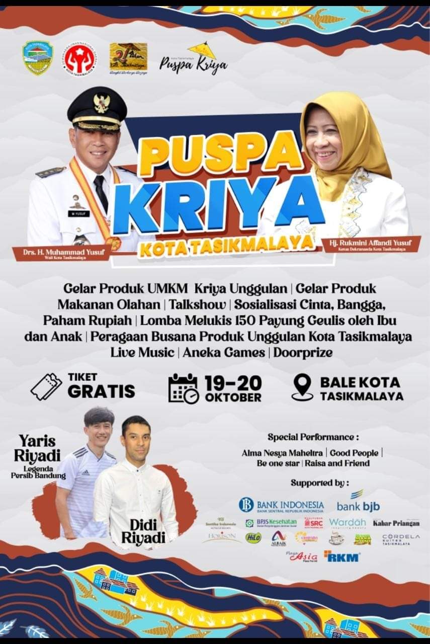 Kota.Tasik (kilangbara.com)-Dalam rangka untuk meriahkan HUT Kota Tasikmalaya ke-21. Besok, Selasa (19/10/2022) Dekranasda Kota Tasikmalaya, akan mengelar acara Puspa Kriya. Di Balekota Tasikmalaya, Jalan Letnan Harun Nomor 1. Kegiatan yang akan berlangsung 19-20 Oktober 2022 itu. Bakal, dimeriahkan oleh kehadiran artis Didi Riyadi dan mantan pemain legenda Persib, Yaris Riyadi.