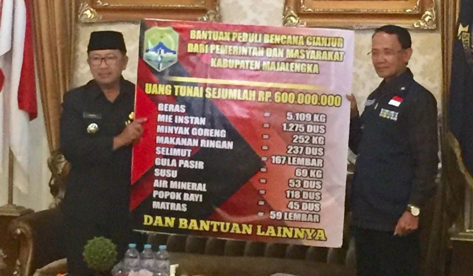 “Dengan donasi ini, diharapkan bisa bermanfaat dan mengurangi beban duka warga Cianjur. Disamping itu, ada 3 tim telah dikerahkan oleh Pemda Majalengka dan telah berada disana yaitu BPBD, Dinsos dan Dinkes,”ujarnya. Saat, menyerahkan bantuan yang diterima langsung Bupati Cianjur di Pendopo Gedung Negara, Rabu (30/11/2022).