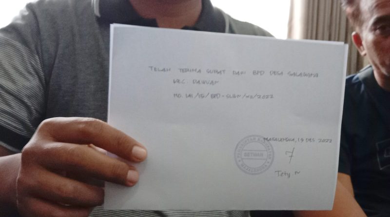 Bahkan, diatas materai dan disaksikan oleh perwakilan BPD dan tokoh masyarakat Desa Salawana juga Forum Masyawarah Desa. Adapun, surat pernyataan pengunduran diri pertama, pada 19 Nopember 2022. Lalu, surat pernyataan prngunduran diri kedua sebagai penegasan disampaikan pada,26 Nopembet 2022