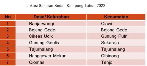 Kegiatan Rehabilitasi Rumah Tidak Layak Huni di Kabupaten Bogor diperuntukan bagi masyarakat berpenghasilan rendah/masyarakat miskin di lingkungan permukiman penduduk perdesaan dan perkotaan. Pada tahun 2022 ini, Pemerintah Kabupaten Bogor alokasi bantuan kepada 1200 KK untuk calon penerima bantuan yang tersebar di 35 Kecamatan dan 198 Desa dan Kelurahan, dan 1.200 KK diantaranya: