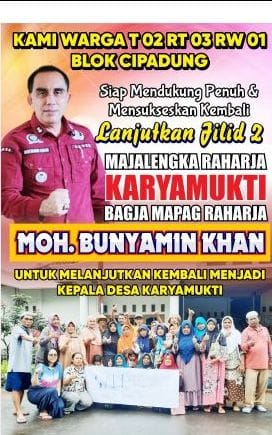 Majalengka (kilangbara.com)-Kinerjanya dinilai terbukti berhasil dalam berbagai program. Sehingga, sangat dirasakan langsung manfaatnya oleh warga. Sehingga tak heran, sang incumbent Kepala Desa Karyamukti, Kecamatan Panyingkiran, Kabupaten Majalengka, Bunyamin Khan. Kini, diminta langsung oleh sejumlah tokoh masyarakat. Supaya, maju kembali untuk kedua kalinya dalam ajang Pilkades.