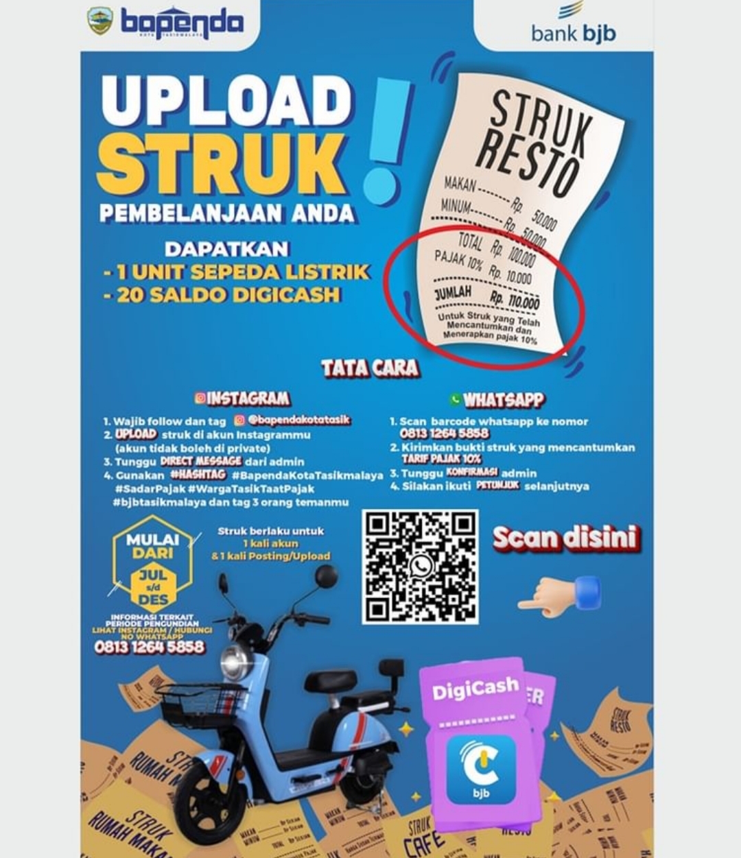 Sedangkan, lewat WhatsApp bisa menghubungi langsung ke nomor 081312645858, kirim bukti struk yang mencantumkan pajak 10 persen, tunggu konfirmasi admin, scand dibarcode dan silahkan ikuti petunjuk selanjutnya. Adapun, hadiahnya itu ada sepeda motor listrik dan 20 saldo digicash. Serta diundi pada setiap bulannya, mulai dari Juli-Desember 2023.