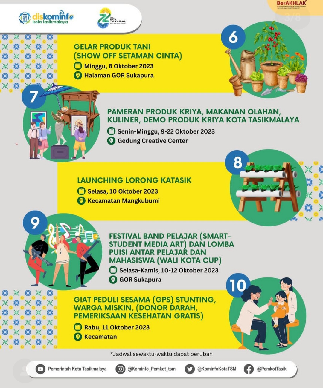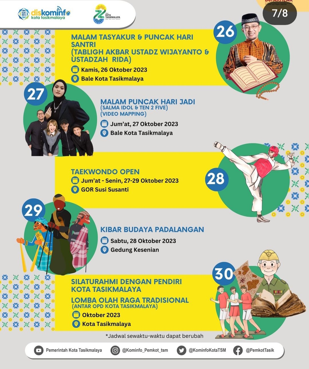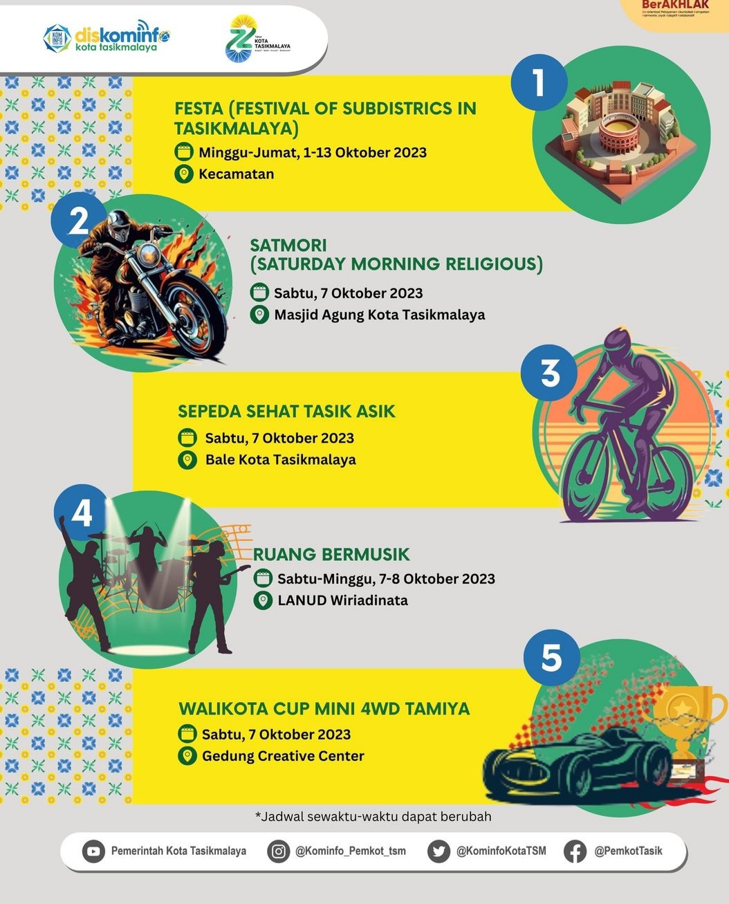 Hampir 1 bulan full Kota Tasikmalaya akan dibanjiri dengan berbagai kegiatan. Tentunya, kegiatan itu sebagai salah satu bentuk hiburan bagi sejumlah masyarakat. Sehingga, ayo ikuti dan meriahkan berbagai acara tersebut. Jangan, sampai ketinggalan untuk menontonnya. Karena, ada sejumlah kegiatan yang menarik. Gaskeun nonton…!!!!