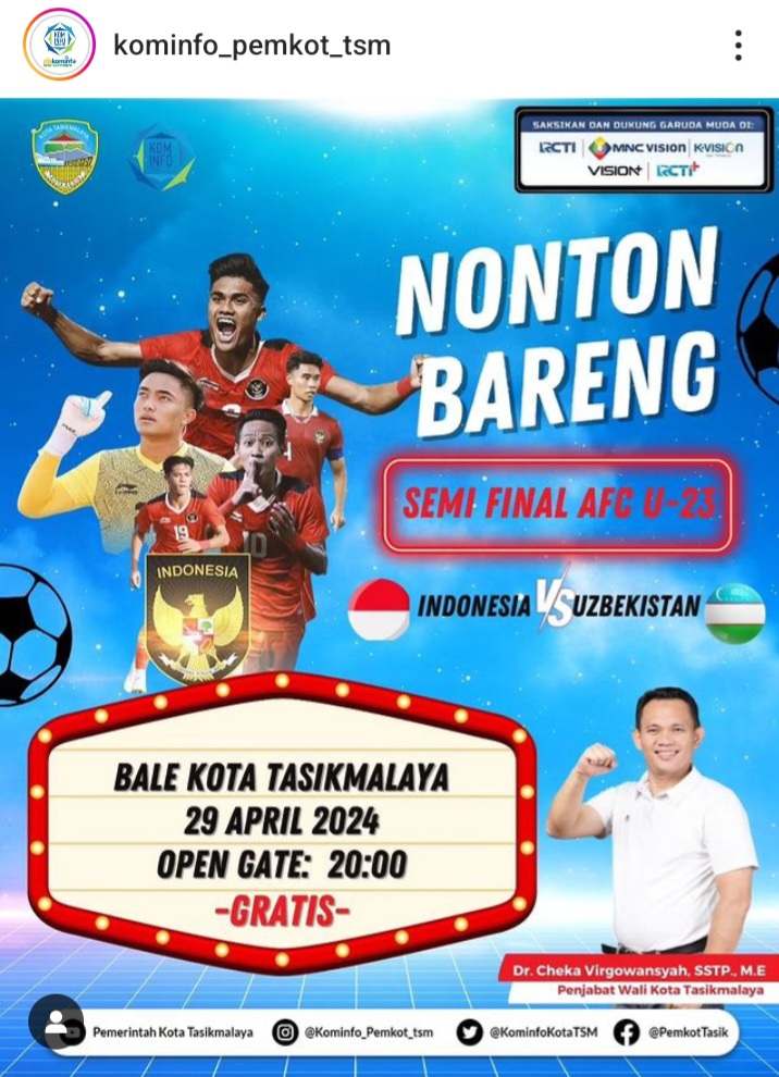 Informasi adanya nobar itu, disampaikan oleh akun instagram kominfo_pemkot_tasik sekitar 1 jam lalu. Dalam captionnya, ditulis : Yuk dukung Timnas Indonesia dibabak semifinal AFC U 23 Tahun 2024. Ingat ya jaga kebersihan dan ketertiban selama nobar berlangsung.