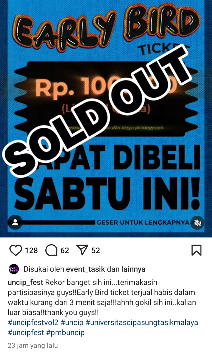 Kepastian tiket sold out itu, disampaikan langsung melalui Instagram dengan akun@uncip_fest sekitar 23 jam yang lalu. Dalam postingan akun centang biru tersebut. Admin itu, mengunggah poto early bird tiket Rp 100 ribu dengan tulisan sold out.