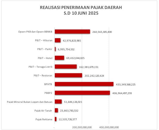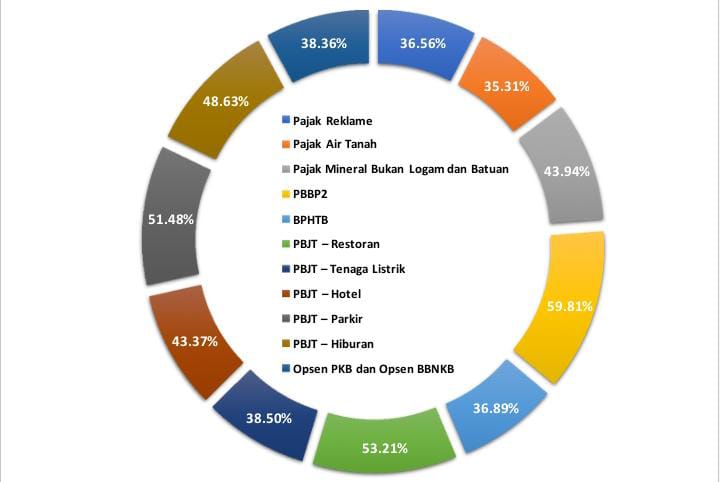 Secara nominal, kontribusi terbesar didapat dari Pajak Bea Perolehan Hak Atas Tanah dan Bangunan (BPHTB). Dengan, capaian Rp 433.349.568.225,00 dan pada urutan kedua terbesar didapat dari Pajak Bumi dan Bangunan Perdesaan dan Perkotaan (PBB-P2). Dengan capaian Rp 406.964.497.293,00 sebagaimana tergambar pada grafik realisasi pajak daerah.
