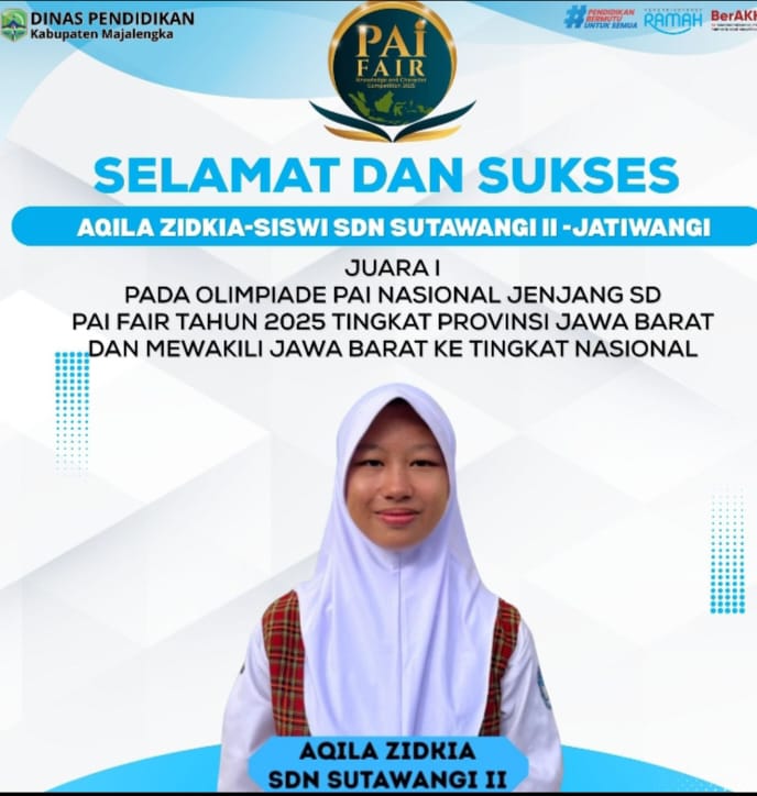 Majalengka (kilangbara.com)-Siswi SDN Sutawangi 2 Kecamatan Jatiwangi, Kabupaten Majalengka, Aqila Zidkia. Berhasil, meraih juara satu pada ajang Olimpiade Pentas Pendidikan Agama Islam (PAI) tingkat Provinsi Jawa Barat.
