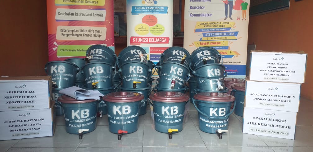 Ciamis (kilangbara.com)-Dalam upaya pencegahan penularan virus Covid-19.Unit Pelaksana Teknis (UPDT) P5A Kampung Keluarga Berencana (KB) Kecamatan Banjaranyar, Kabupaten Ciamis.Lakukan baksos dengan menyalurkan bantuan alat cuci tangan, APD dan masker ke sejumlah fasilitas umum.