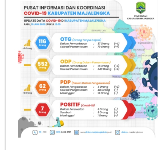 Sedangkan data Orang Dalam Pemantuan (ODP) dan Pasien Positif Covid-19 Majalengka sama seperti hari sebelumnya.Adapun hari ini, terdapat ODP 116 orang terdiri dari 37 orang dalam pemantuan dan 79 selesai pemantuan.Terkait ODP 552 orang, dengan rincian dalam pemantuan 14 orang dan selesai pemantuan 538 orang.