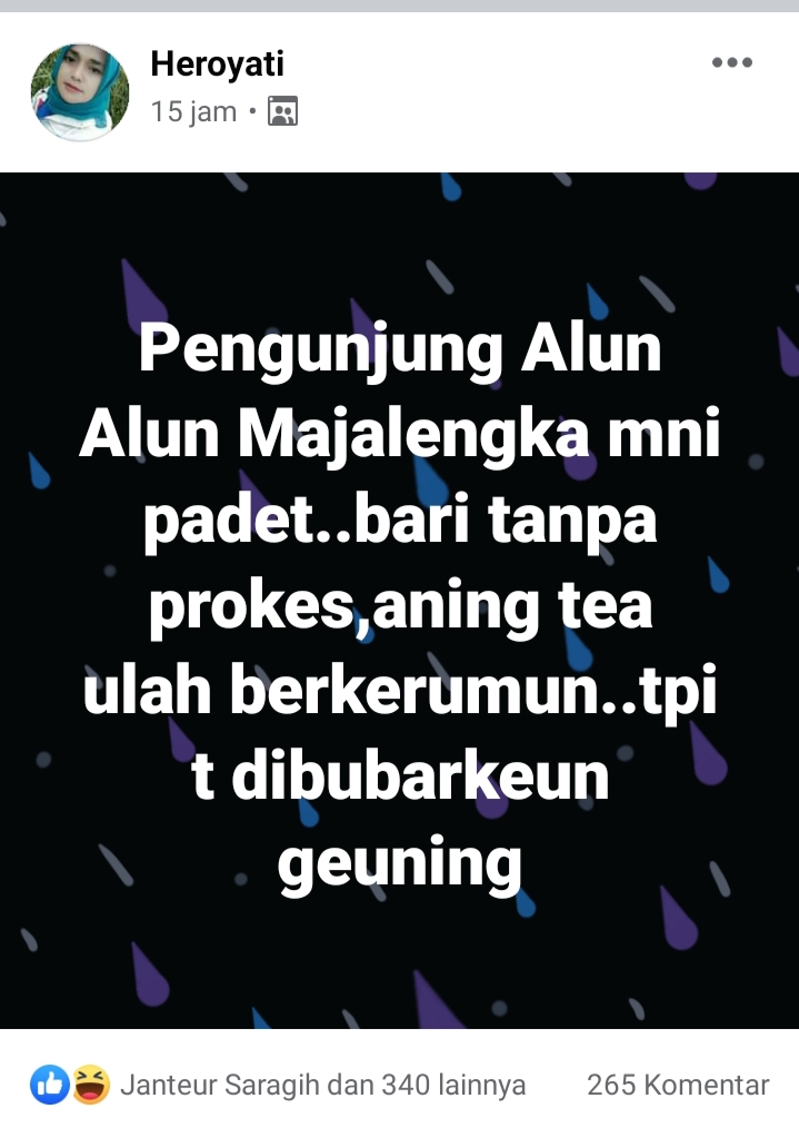 Akibatnya, diprotes dimedsos oleh salah satu netizen melalui akun Heroyanti. Dengan sebuah postingan yang dikirim ke grup Suara Masyarakat Majalengka. Dalam unggahannya tersebut ditulisnya, “Pengunjung Alun-Alun Majalengka meni padet, bari tanpa prokes, aning tea ulah berkerumun, tapi teu dibubarkeun gening”.