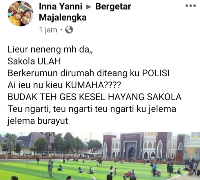 Selanjutnya, Inna Yanni menyebutkan,  lieur neneng mah da, sakola ulah, berkerumun dirumah diteang ku polisi,  ari kieu nu kieu kumaha??budak teh ges kesel hayang sakola, teu ngarti ku jalama nu burayut.(Sam)