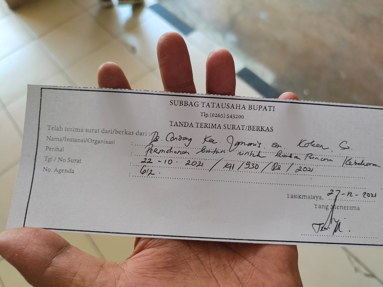 “Hari ini sudah saya berikan proposal tersebut kepada Bupati Tasikmalaya, sesuai dengan prosedural dan ini ada tanda terimanya. Semoga saja bantuan itu segera terealisasi,”harapnya.(AR)