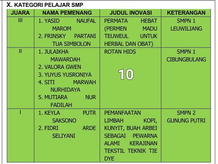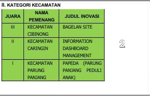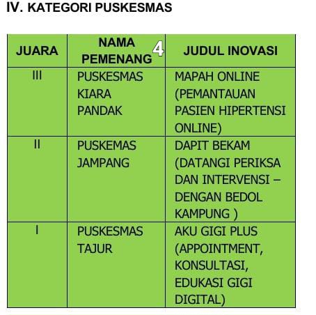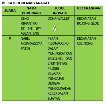 “Saya merasa bangga dengan kontribusi para inovator dalam menciptakan ide, gagasan, terobosan, dan inovasi yang menjadi dasar tanggung jawab, rasa memiliki, dan kebersamaan dalam pembangunan Kabupaten Bogor,”ujarnya.