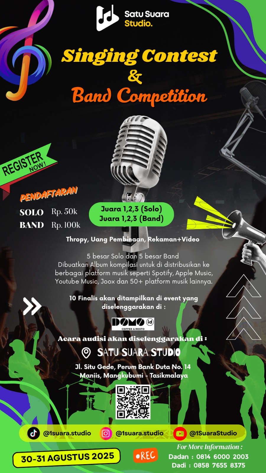 SATU SUARA STUDIO Jalan Situ Gede, Perum Bank Duta No.14, Maniis Kota Tasikmalaya. Sementara itu penampilan finalis, Minggu, 7 September 2025 di DOMO Coffee & Resto.